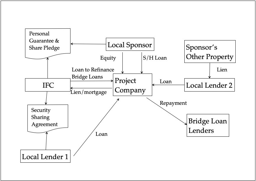 当該国の地元民間スポンサーは、既に小規模ブティック・ホテルの経営に成功しており、自己資金と地場銀行三行からの中期ローンと短期ブリッジ・ローンを利用して五つ星リゾート・ホテルの建設を開始していました。ホテル建設がほぼ完了した段階で、彼らはブリッジ・ローンをリファイナンスする為に、IFCから長期ローンを借り入れました。IFCはホテル全資産の抵当権を取得し、さらに民間スポンサーの個人保証を取得しました。地場銀行1とIFCはこの担保と保証をシェアしました。他の地場銀行2はすでにスポンサーの小規模ホテル資産を担保に持っていました。