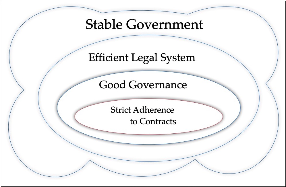 ビジネス環境について簡単に触れます。プロジェクト・ファイナンスに携わる者が必要としているのは、下図の一番下にある、全ての契約当事者による”Strict Adherence to Contracts”です。しかし、ビジネス環境の劣悪な国では、契約条件がしばしば無視されます。それは、経営者や政府関係者が、頻繁に公私混同するというGovernanceの欠如に起因することが多いです。そういった問題は、Efficient Legal Systemが不在の為に、契約違反、法律違反、横領等がしばしば罰せられません。それらは、不安定な政府により作り出されている、ネガティブな連鎖の温床によることが多いです。言い換えれば、良いビジネス環境のためにはStable Governmentが不可欠であり、その様な政府が存在しない地域でプロジェクト・ファイナンスを組成するのは非常に困難であり、たとえ組成できたとしても、プロジェクトが破綻するリスクが非常に高いと言わざるを得ません。