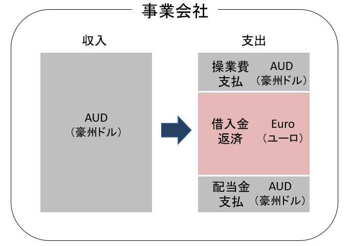 【豪州風力発電事業会社の収入と支出の通貨 – 借入金がユーロの場合】