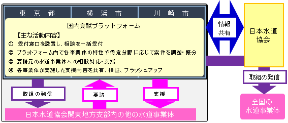 支援実施にあたり、まずは首都圏(公益社団法人日本水道協会関東地方支部内)における水道事業体からの要請を受けることから始める。3事業体 で「国内貢献プラットフォーム」を設置し、相談を一括して受ける共通の窓口とする。要請を受け、3事業体はそれぞれが有するノウハウや技術力を活かし、水道施設の老朽化や人口減少に伴う料金収入の低迷に苦しむ全国の水道事業体を支援する。