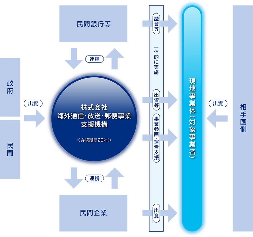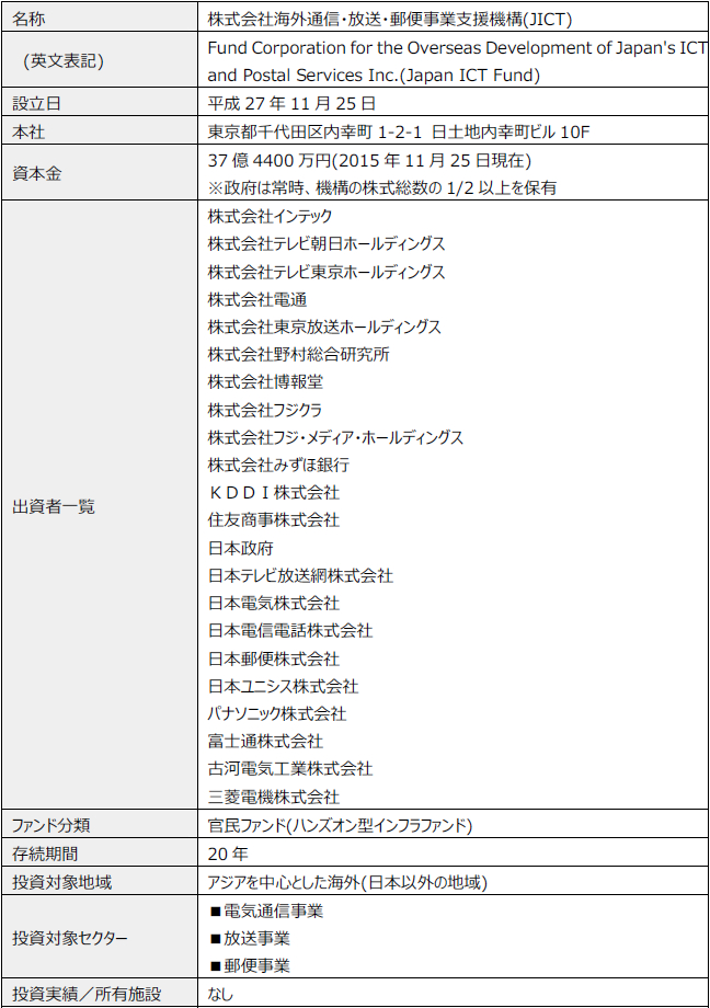内容の確認は下記リンク先でできます。 ・『株式会社海外通信・放送・郵便事業支援機構の設立』 - 総務省、2015年11月25日 ・『株式会社海外通信・放送・郵便事業支援機構の概要』 - 総務省、2015年11月25日 ・『株式会社海外通信・放送・郵便事業支援機構』 - JICTウェブサイト、2015年11月25日